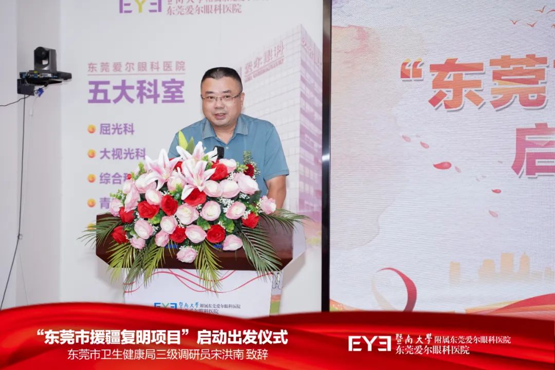 At the event site, Xu Shaowei, President of Dongguan Disabled Persons' Welfare Foundation, Cai Shuqiang, Part-time Vice Chairman of Dongguan Disabled Persons' Federation, Song Hongnan, Third-level Researcher of Dongguan Municipal Health Bureau, Liang Jieqiu, leader of the Cultural, Educational and Medical Group of the Guangdong Aid Xinjiang Task Force in Xinjiang and Deputy Mayor of Dongkeng Town, Yu Weihong, Deputy Director of Dongcheng Street Office, Chen Junquan, Director of Dongcheng Street Health Bureau, Deng Bingjian, Deputy Director of Humen Town Health Bureau, and Luo Zhifeng, Director of the Party Building Service Center of the Two New Organizations of Dongcheng Street, Wang Haibo, director of the Party Building Service Center of the two new organizations in Humen Town, Lu Chao, deputy secretary of the Dongguan Disabled Persons' Welfare Foundation, Liu Fei, president of Aier Eye Hospital Dongguan Region, Zhang Ling, general manager of Aier Ophthalmology Guangzhu District, and other leaders jointly launched the "Dongguan Aid Xinjiang Restoration Project", and Yi Yan, head of Dongguan Humen Aier Eye Hospital, presided over the meeting.