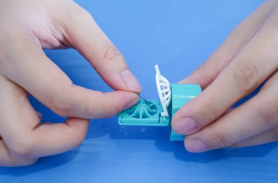 正确操作方法:指腹托住镜片,分开镜盒卡槽将镜片轻轻放入,确认镜片放置在镜盒中央,再盖紧盖子,避免被盖子夹碎。