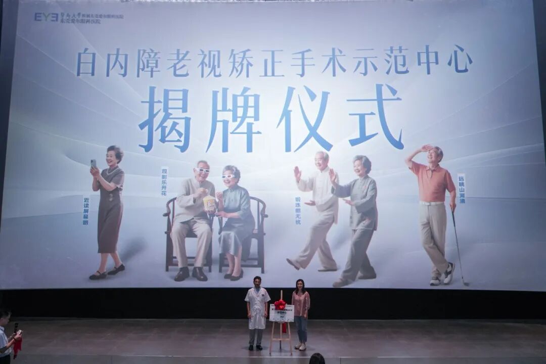 科普活动现场,爱尔康广东私立省区经理王蓉女士与东莞爱尔眼科医院罗平主任共同为“白内障老视矫正手术示范中心”荣誉牌匾揭牌,将为东莞及周边地区中老年群体提供更优质的白内障、老花、近视、散光和远视等一站式矫正诊疗方案。